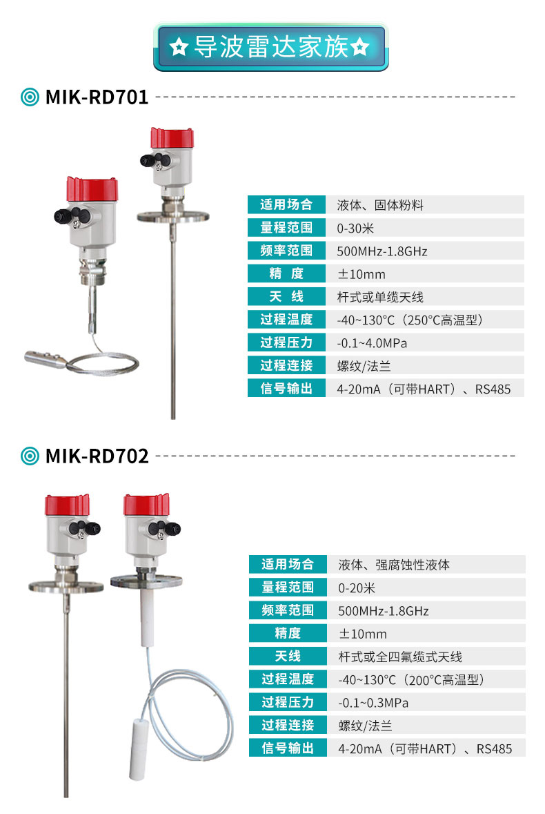 由于采用了先進的微處理器和獨特的 Echo Discovery 回波處理技術(shù),導波雷達物位計可以適用于各種復雜工況及應用場合。如:高溫、高壓及小介電常數(shù)介質(zhì)等;而采用脈沖工作方式,導波雷達物位計發(fā)射功率極低,可安裝于各種金屬、非金屬容器內(nèi),對人體及環(huán)境均無傷害。