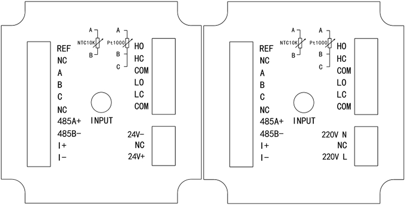 ■C: 溫度補(bǔ)償端C,PT1000 三線制的溫度地,接 PT1000 兩線制需短接到 B,接 NTC10K 時(shí) C 端懸空