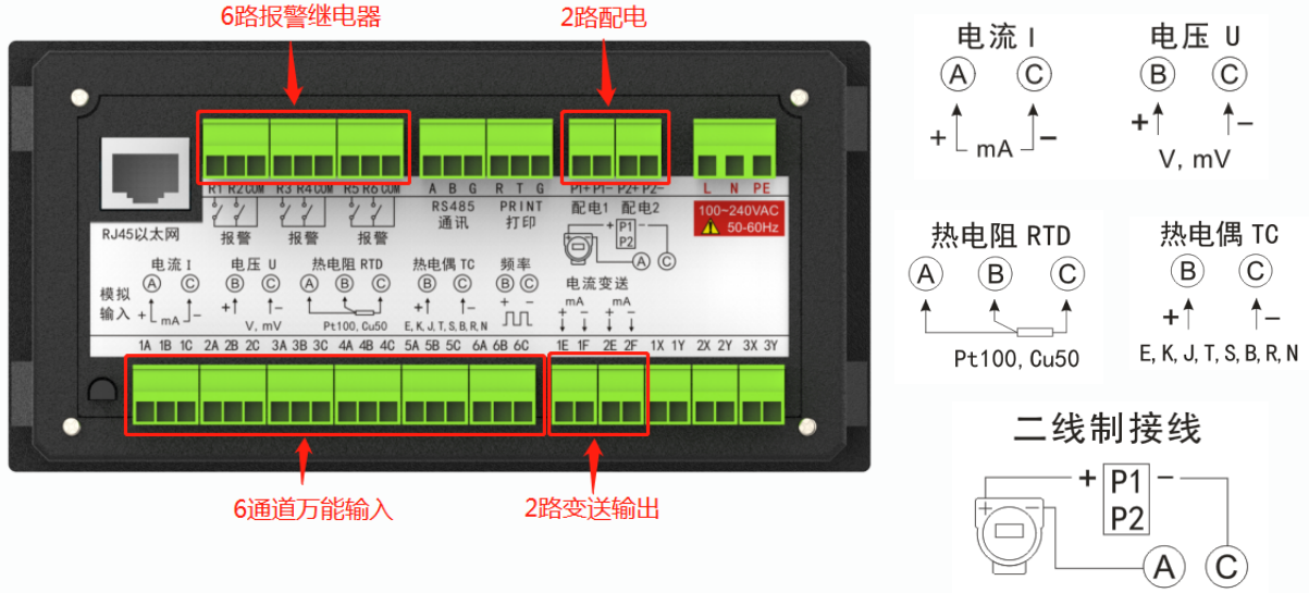 2、 2 路電流變送輸出,2 路直流 24V 配電